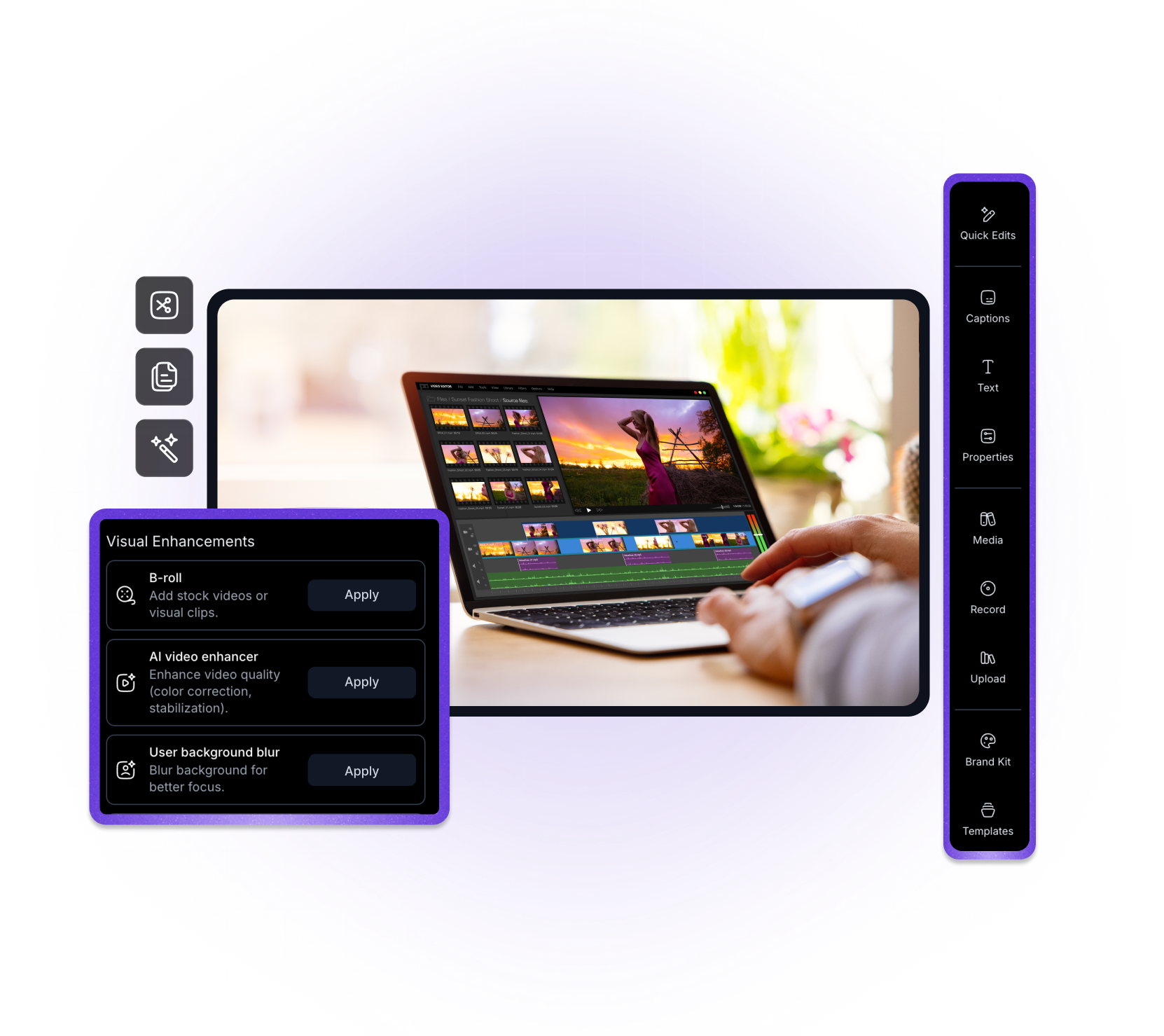 Add B-roll, overlays, stock videos, images, and graphics to strengthen storytelling and increase visual engagement.