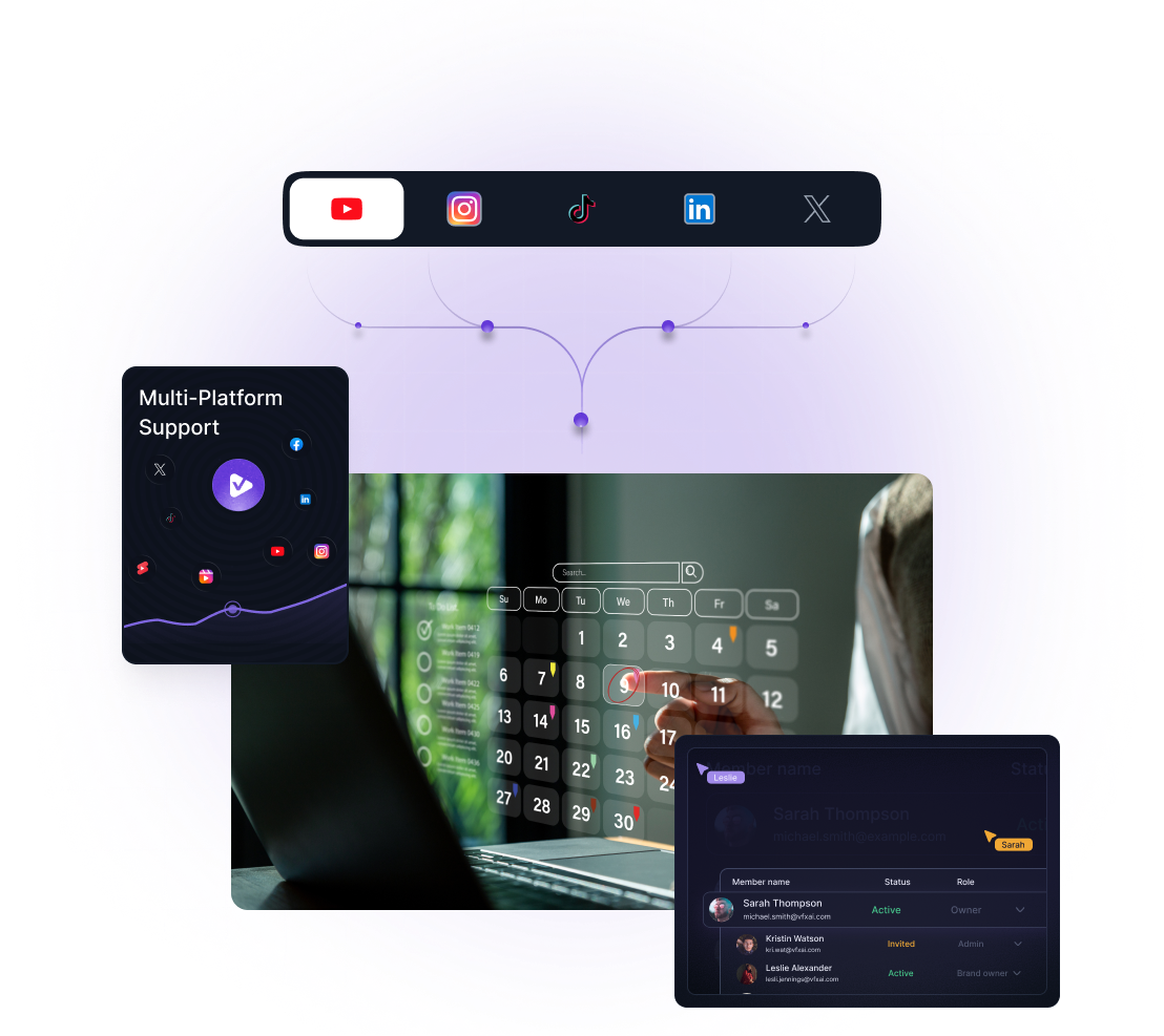 Create a single post and publish it across YouTube, TikTok, Instagram, Facebook, Linkedin, and X, all at once or on your schedule.